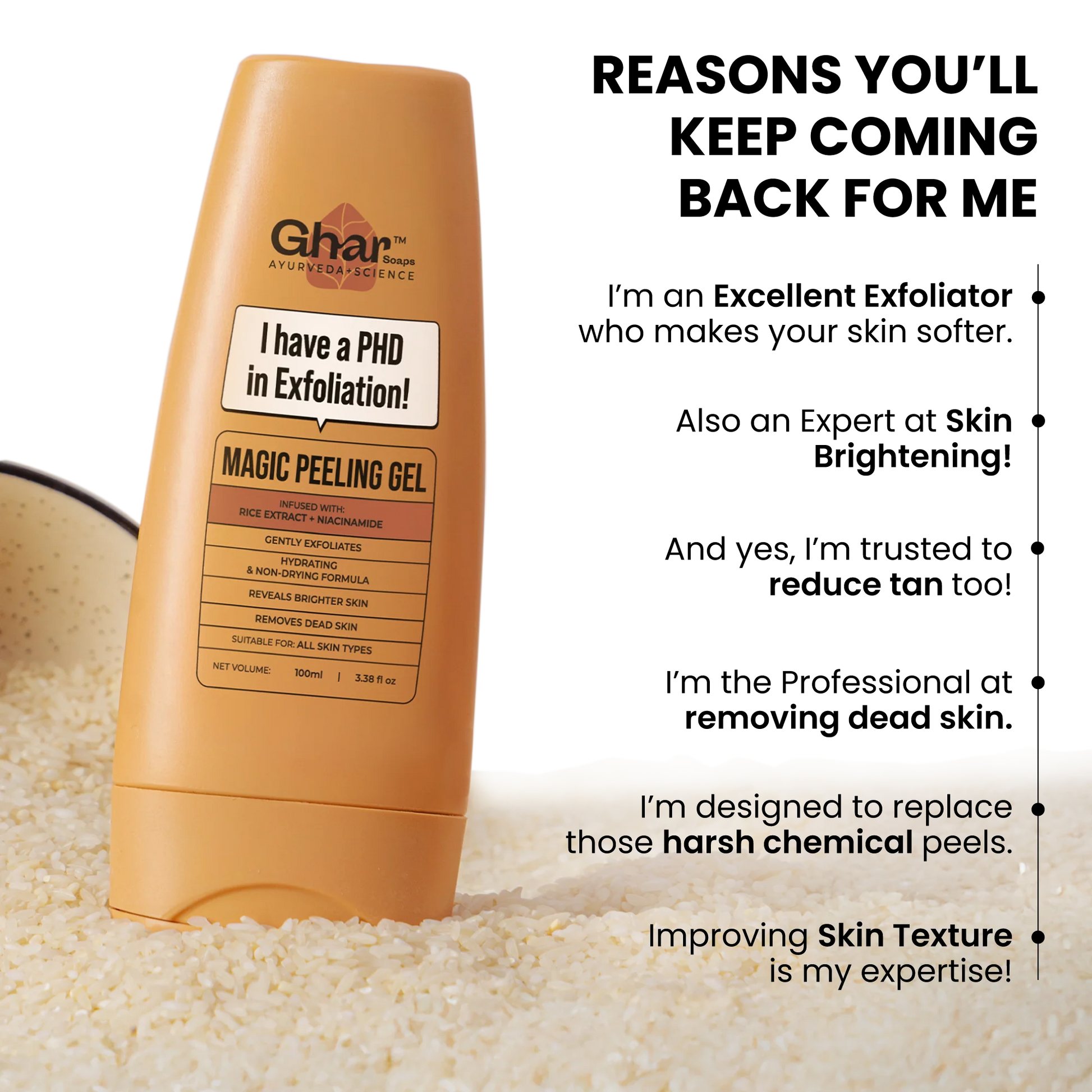 I’m the Natural replacement for those AHA, BHA & PHA chemical peeling solutions. I’m a gentle yet effective exfoliator, here to remove dead skin without leaving you dry or stretchy. Specialised to restore hydration and bring brightness, I’m suitable for all genders & skins, even the sensitive ones.